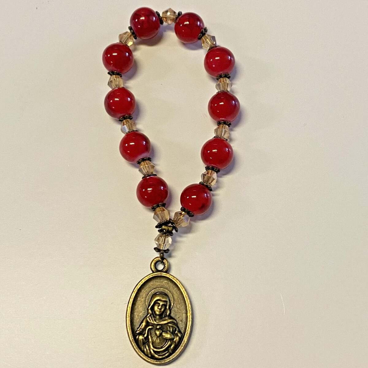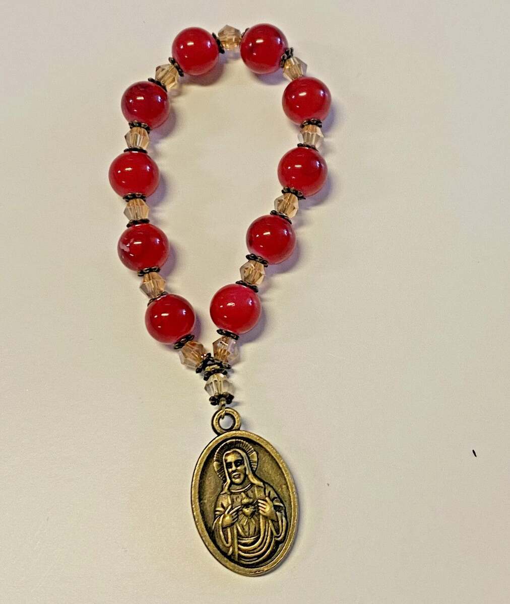 You are purchasing a very nice, red marbled 1 decade rosary that comes with a Sacred Heart Immaculate Heart of Mary Medal.