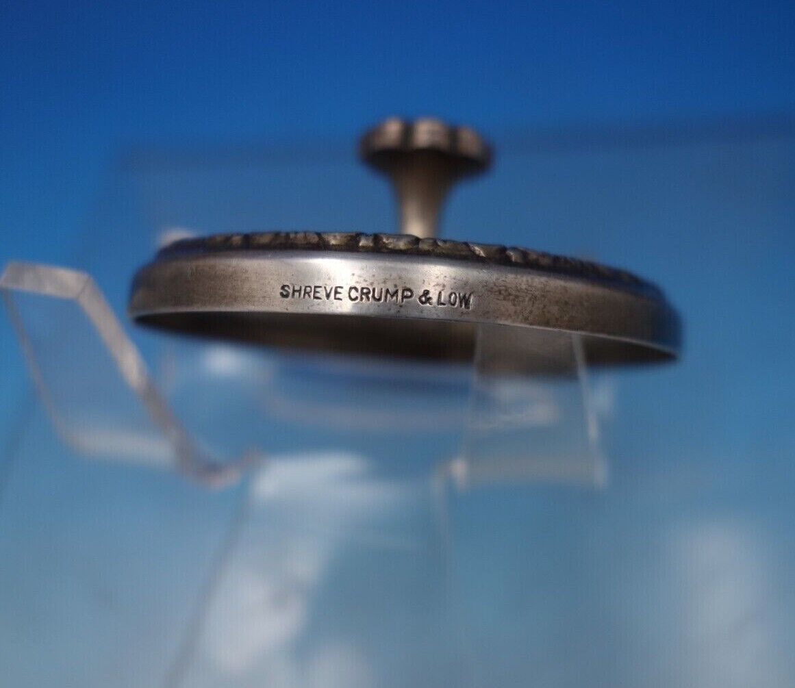 Pretty Repousse by Kirk sterling silver lid (for mustard pot) marked #17 retailed by Shreve Crump and Low. This piece measures 2" in diameter and weighs 0.68 troy ounces. It is not monogrammed and is in good vintage condition. Lovely!