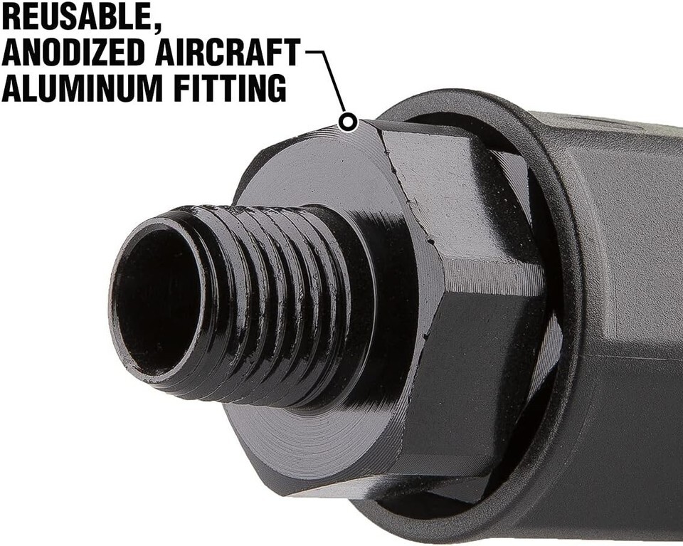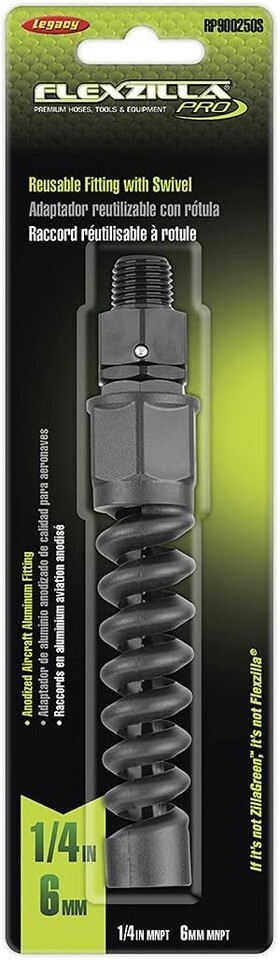 The Legacy RP900250S reusable swivel fitting is engineered for field repair and customization of Flexzilla and Flexzilla PRO 1/4" air hoses. Machined from anodized aircraft-grade aluminum, it features a 360 rotating male NPT inlet that reduces hose twist, minimizes wear at the connection point, and improves tool ergonomics in tight or dynamic workspaces. Designed for tool-free hose replacement using only two wrenches, the fitting clamps securely onto the hose barb without crimping?enabling multiple reuses without degradation. Its lightweight, corrosion-resistant build ensures reliable performance in demanding pneumatic applications, from automotive shops to industrial manufacturing.