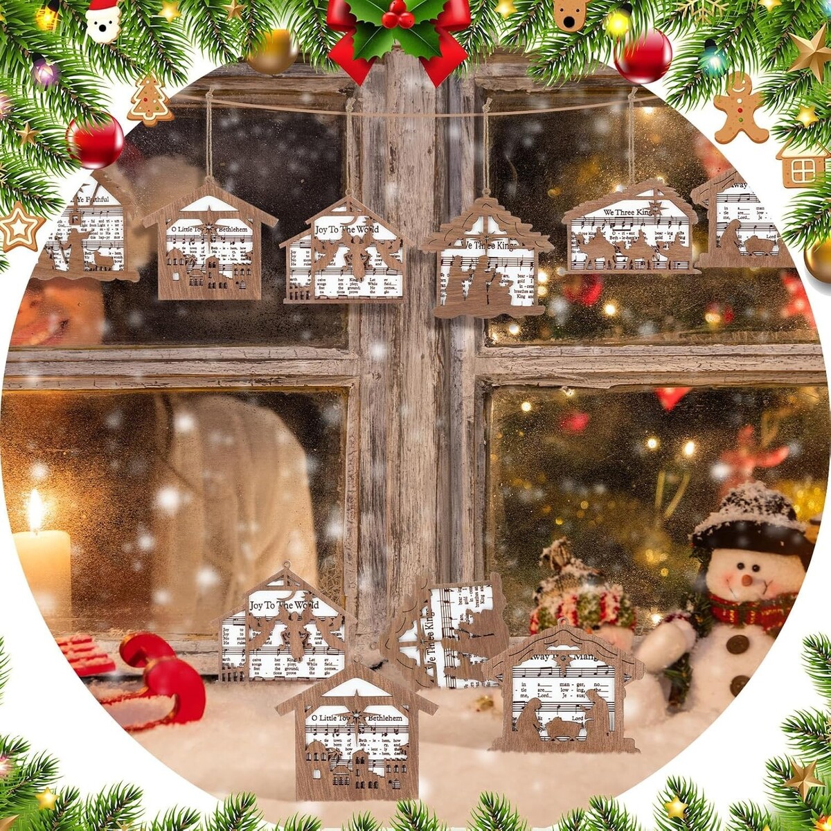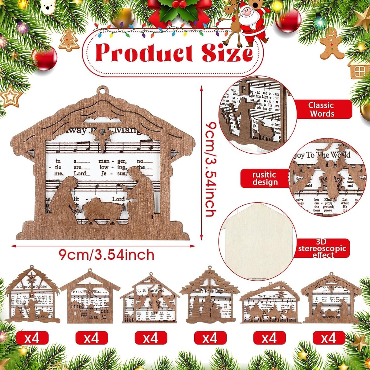 this package includes 24 wooden Nativity music sheet story ornaments for you to creatively decorate your Christmas tree; Every scene from the Nativity story is beautifully crafted, capturing the wonder and celebration of Jesus' birth; It is indeed a fashionable and spirit lifting way to worship
