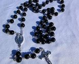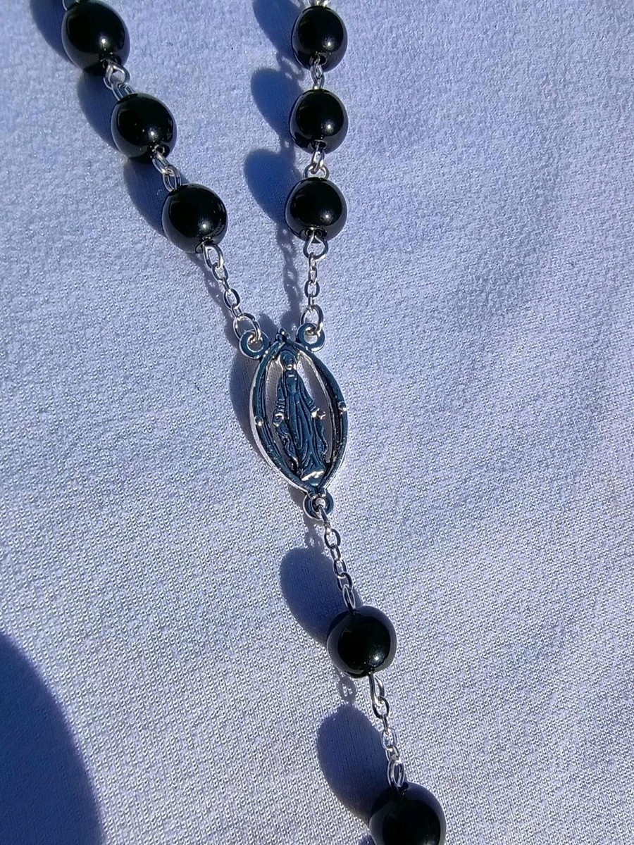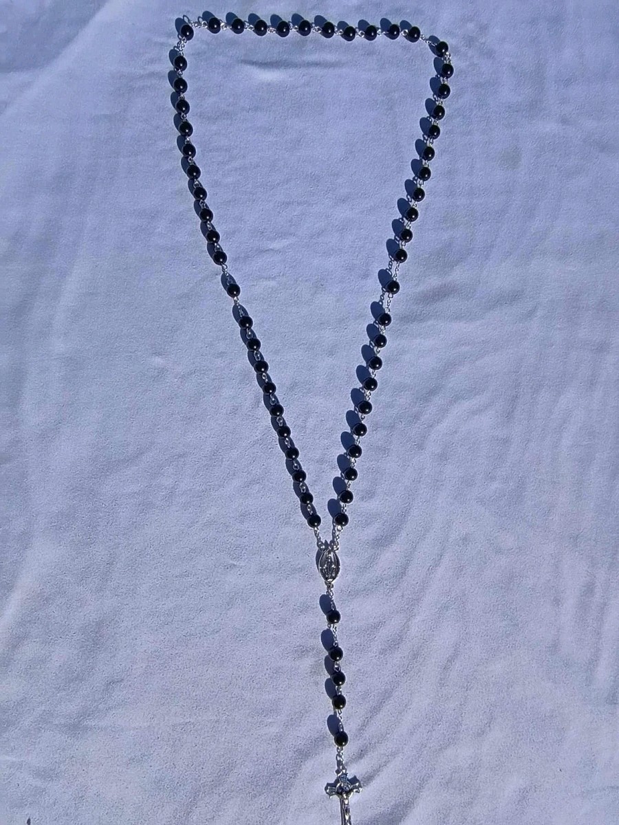 This striking rosary features glossy 8mm black glass beads hand-linked with silver-tone wire, creating a bold and elegant contrast. The smooth black beads pair beautifully with a detailed silver crucifix and a Miraculous Medal centerpiece, giving this rosary a timeless, reverent look. Perfect for both men and women, it is strong, classic, and deeply devotional.