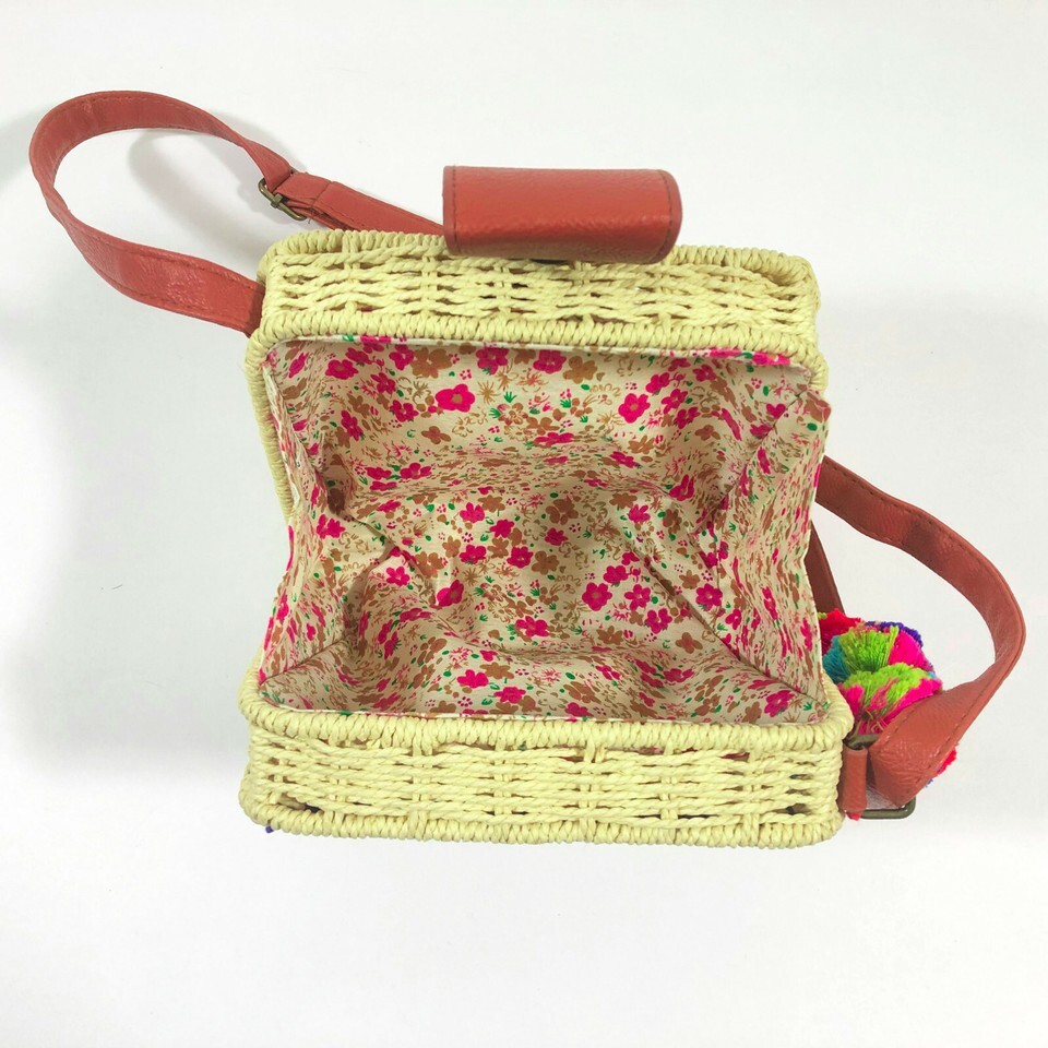 EUC, Excellent Used Condition unbranded small shoulder/cross body straw box bag is perfect for a summer date. Room for you cell, small wallet, keys, and lipstick. Faux leather adjustable strap pretty floral fabric lining. Fun woven multi-color threads accent the front along with 3 multi-color pom poms at the side of one strap. Easy open and close antique brass color buckle flap closure with faux brown leather . There are 4 antique brass color feet on the bottom No rips, tears or stains. Made in China No inside pockets Antique color brass hardware 7x6.5x3 inches Adjustable up to 22 inch strap drop SKU Q027