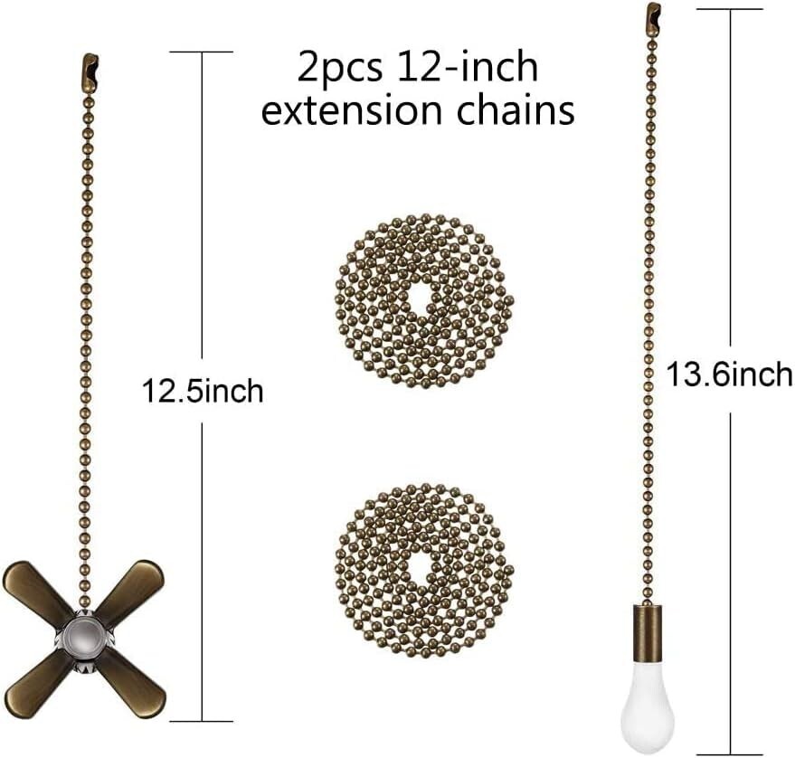 About this item Come with 2 pieces pull chain extender (1x fan cord, 1x bulb cord) + 2 pieces extension chains. Maximize extend 24 inch long for high mounted ceiling fans and light fixtures Visible light bulb and fan cord design, it is so easy to distinguish the light or fan switch, no more wrong pulls even in the dark Standard 3mm diameter beaded ball chain, made of rust-proof and durable copper, very hard to pull off for long term use