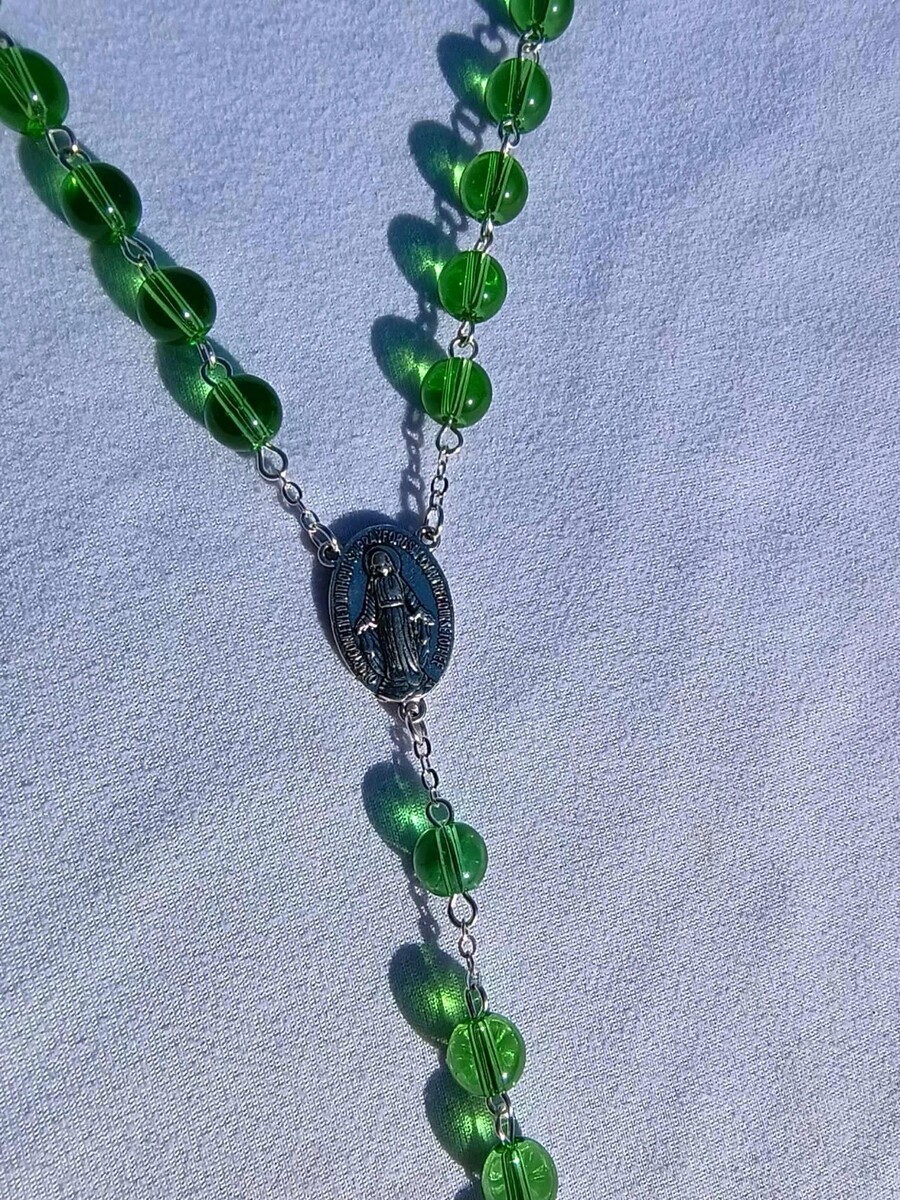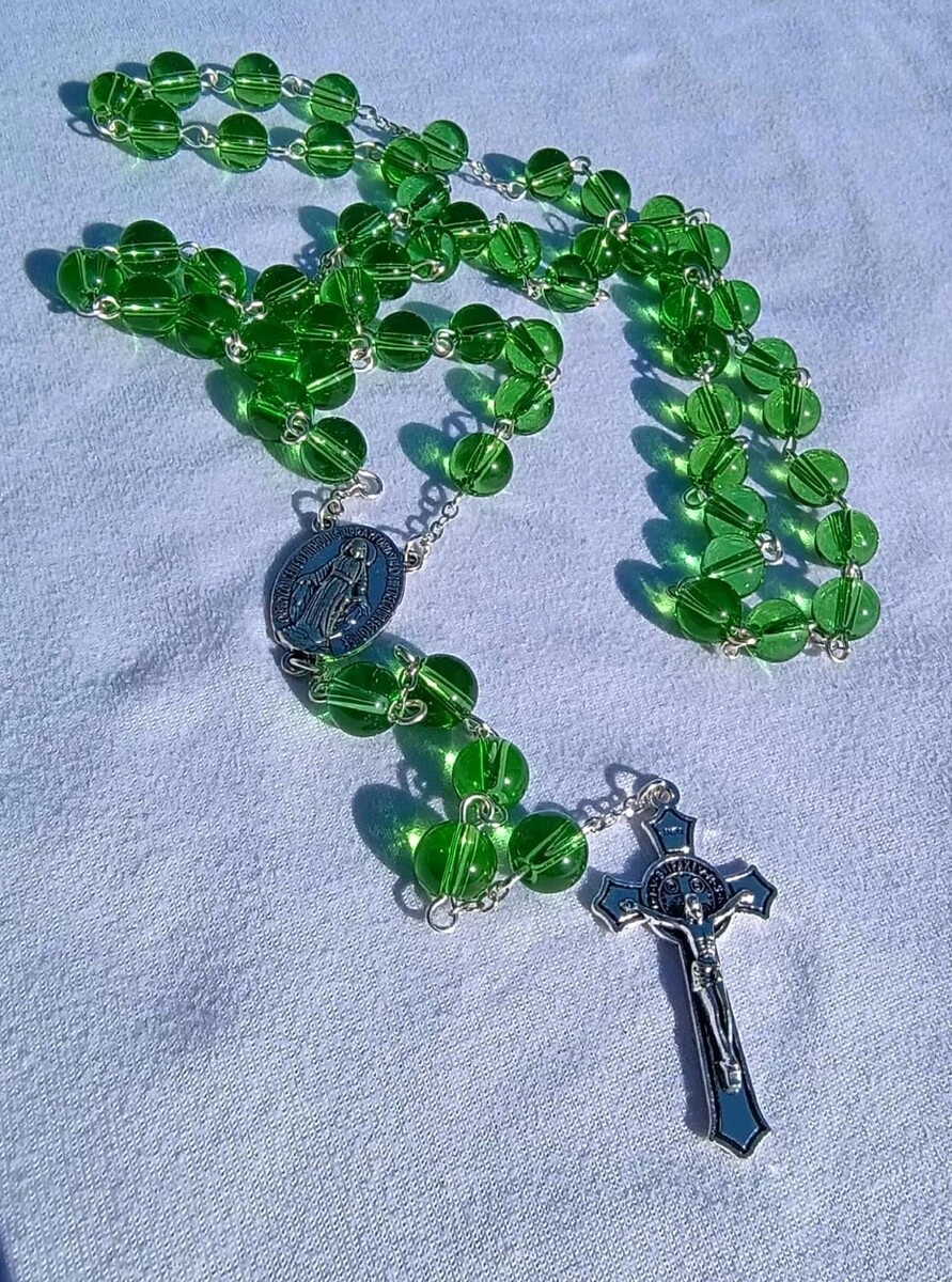 This uplifting rosary features 8mm transparent green glass beads that shine beautifully in the light. Each bead is hand-linked with silver-tone wire, giving the rosary a crisp, clean, refreshing look. It is finished with a detailed silver crucifix and a Miraculous Medal centerpiece, creating a meaningful devotional piece full of hope and grace.