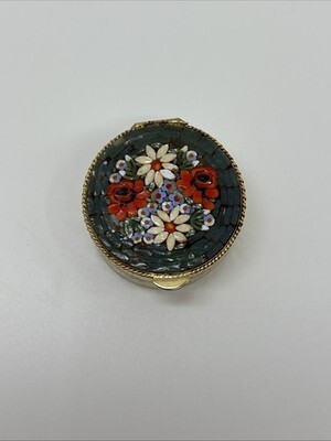 The VTNG Micro Mosaic Flower Gold Tone Oval Snuff Pill Box is a beautifully handcrafted piece originating from Italy. Featuring intricate red, blue, and white flower designs, this snuff pill box is a stylish and delicate collectible item perfect for storing small items like snuff or pills. With a timeless gold tone finish, this piece adds a touch of elegance to any collection. The tiles need to be cleaned due to the delicate nature. I will let the buyer do that.