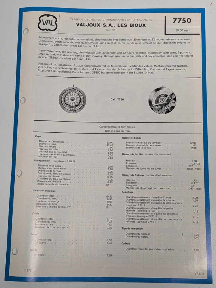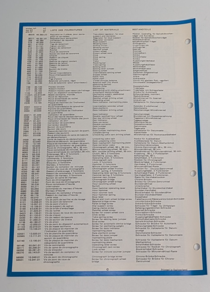 Valjoux Cal 7750 7765 7755 Chronograph Technical Bulletin Parts Diagram List