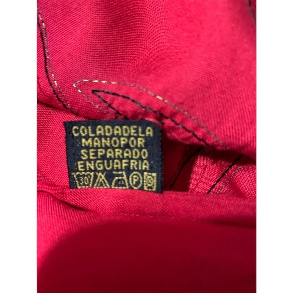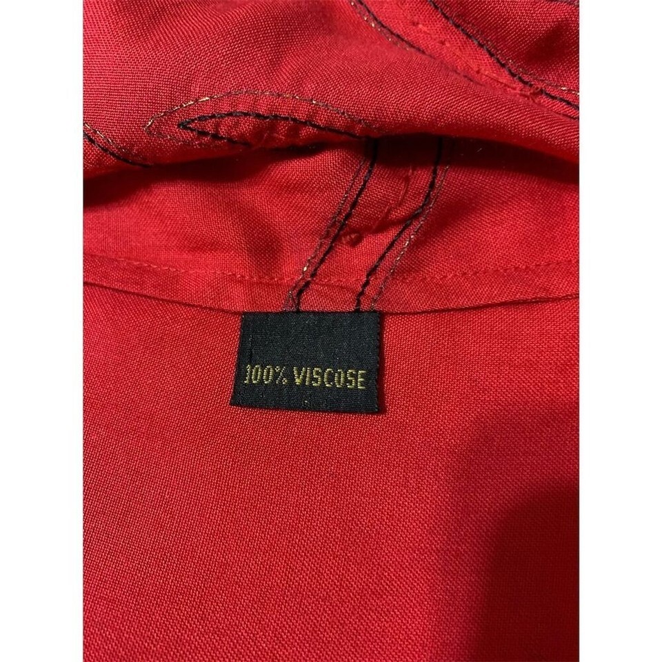 This women's red blouse is made from silk and features a V-neckline with long sleeves. It has a solid pattern with beaded accents, adding a touch of glamour to its basic style. , this vintage-inspired piece is perfect for winter events. The blouse is a regular fit and requires dry cleaning. It is pre-owned. Missing size label, looks like a large. Check all images.