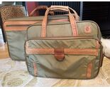 Discover a rare find-a 6-compartment carry-on luggage bag in a unique light olive-green nylon with genuine tan leather accents and trim.