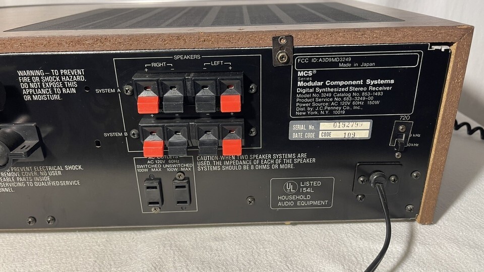 This vintage MCS 3249 stereo receiver is a digital synthesized AM-FM modular component system that was made in Japan. It is a unique unit that requires cables, connectors, and speakers to operate. This item is being sold as "for local Michigan pickup only" and the seller will not ship this item. The unit type is a module and it comes with one unit quantity. This model is perfect for those who are interested in vintage electronics and audio. It is a great addition to any collection and can be a conversation starter. Please refer to the provided images and feel free to contact me with any questions. Thank you for considering this item.