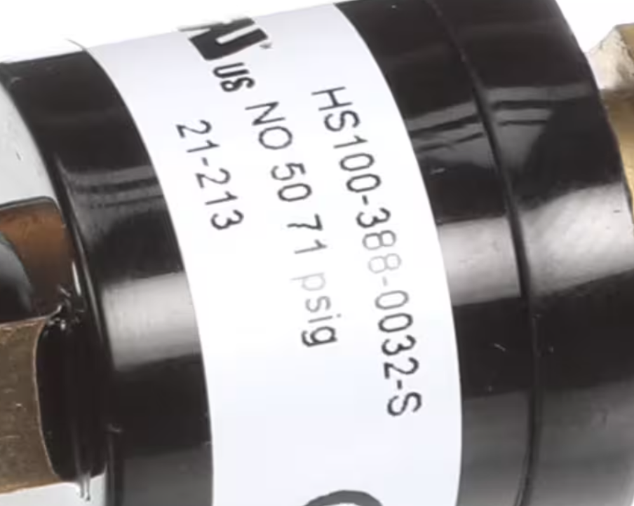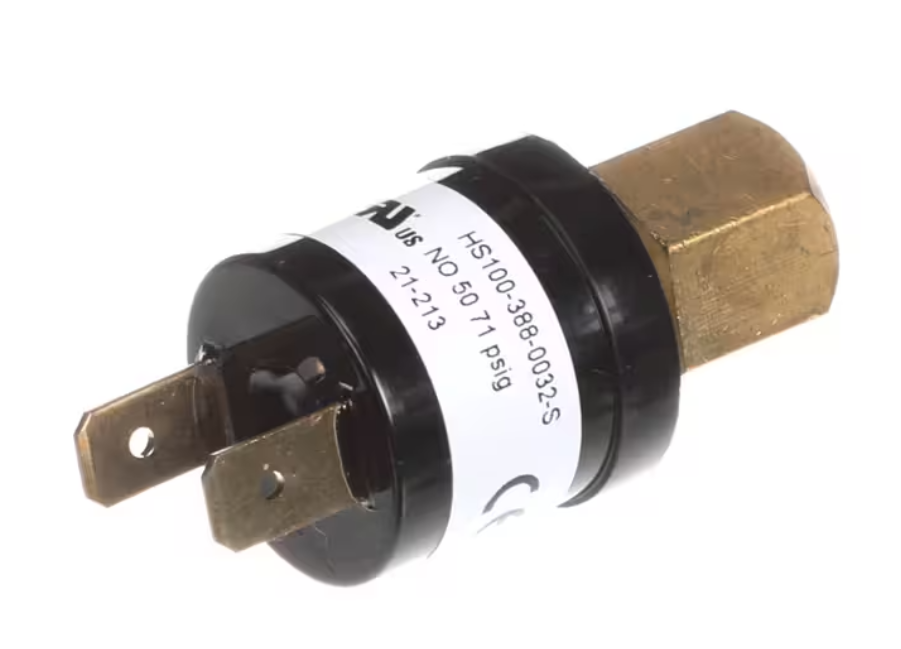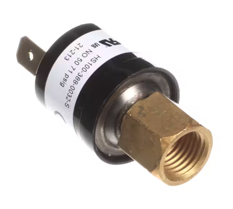 The York S1-5992114 (HS100-388-0032-S) Pressure Control Switch is a reliable OEM safety control device designed to monitor system pressure and protect HVAC components from operating outside safe limits. This model features a 50 PSIG open and 71 PSIG close range with a flare connection, ensuring accurate pressure regulation and dependable performance in York air conditioning and refrigeration systems.