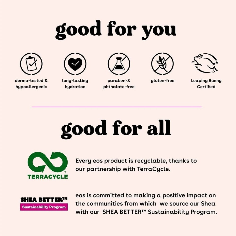 ALL-NATURAL SHEA BUTTER: eos skin care products have wild grown, sustainably-sourced 100% natural shea butter to make skin feel moisturized, protected and soft. We are paraben, phthalate and gluten free. Dermatologist tested. Vegan. Hypoallergenic. Leaping Bunny certified. No products tested on animals